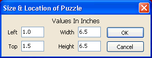 Now edit the values in this window. In this example we'll make a large puzzle area. In the Left field, enter 1.0. This leaves a 1.0 inch margin on the left. Enter 1.5 in the Top field to leave a margin of 1.5 inches at the top. Enter a width of 6.5 and a height of 6.5 to make the puzzle box 6.5 inches square. Click OK to save the changes. The Puzzle box will resize and move to the coordinates we entered.