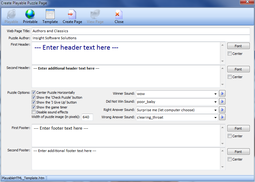 Click on the Playable button to toggle between the options to create a static puzzle web page or a playable puzzle web page.