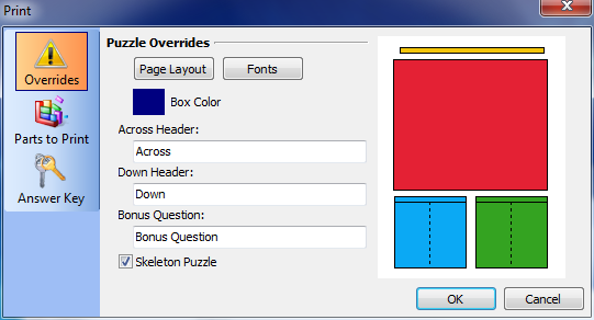 To begin the print process, click on File | Print Puzzle or click on the Printer icon. The following Print window appears. This window allows you to override various puzzle components before printing, adjust fonts and print answer keys.